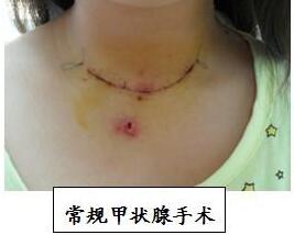 传统开刀手术创伤比较大,有10公分左右的疤痕,十分影响美观!更为重要的是,易造成继发性终身甲减。